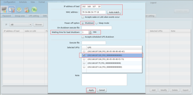 2. 輸入負載的IP地址,MAC地址,選擇電源關閉選項,輸入關閉負載的等待時間,選擇UPS,然后點擊“應用”按鈕,參見圖2-1。
