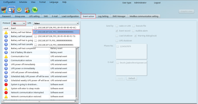 3. 轉到事件動作頁面,然后選擇協(xié)議,UPS和事件,如圖3-1所示。例如,選擇“交流故障”事件,然后選擇發(fā)送類型,選擇負載關機、UPS關機、輸入負載關機等待時間、負載關機提醒、關機前彈出的對話框、警告對話間隔、UPS關機等待時間,然后點擊“應用”按鈕,參見圖3-2。